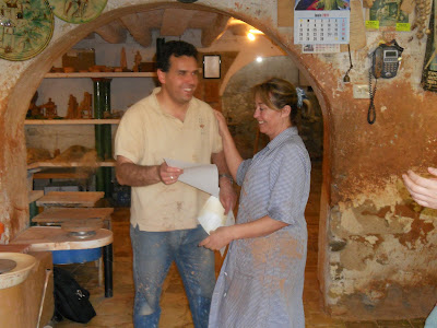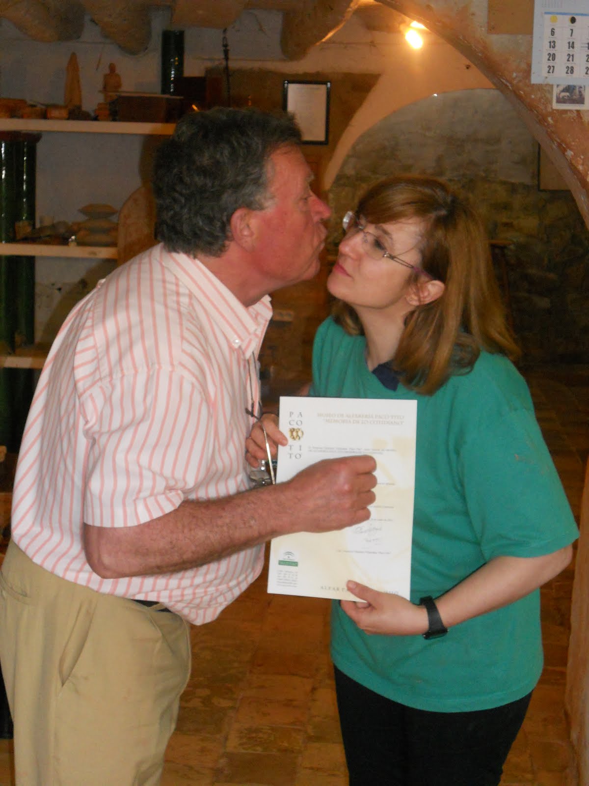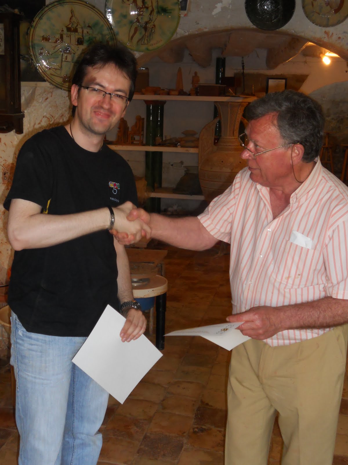 En la tarde de hoy se ha dado por concluido el curso de alfarería y escultura que dio comienzo en el pasado mes de Septiembre. Han sido nueve meses (164 horas), en las que hemos pasado muy buenos momentos, muchos de los alumnos nunca habian tenido contacto con el barro y ahora ya son «pequeños grandes maestros», pero sobre todo ya son nuestros amigos. Hemos creado un grupo de buena amistad y confianza, con nuestros ratos de risas y nervios, de ilusión, de esfuerzo, de bromas, de trabajo para centrar la pella, para dar forma a los primeros platillos. Después de este tiempo han salido de sus manos, ardillas, platos, pucheros, tazas, azucareros, lagartos, un busto de Álvaro, jarras, «cuchis», etc. Hoy le hemos hecho entrega de su título y también de nuestro cariño. MUCHAS GRACIAS.