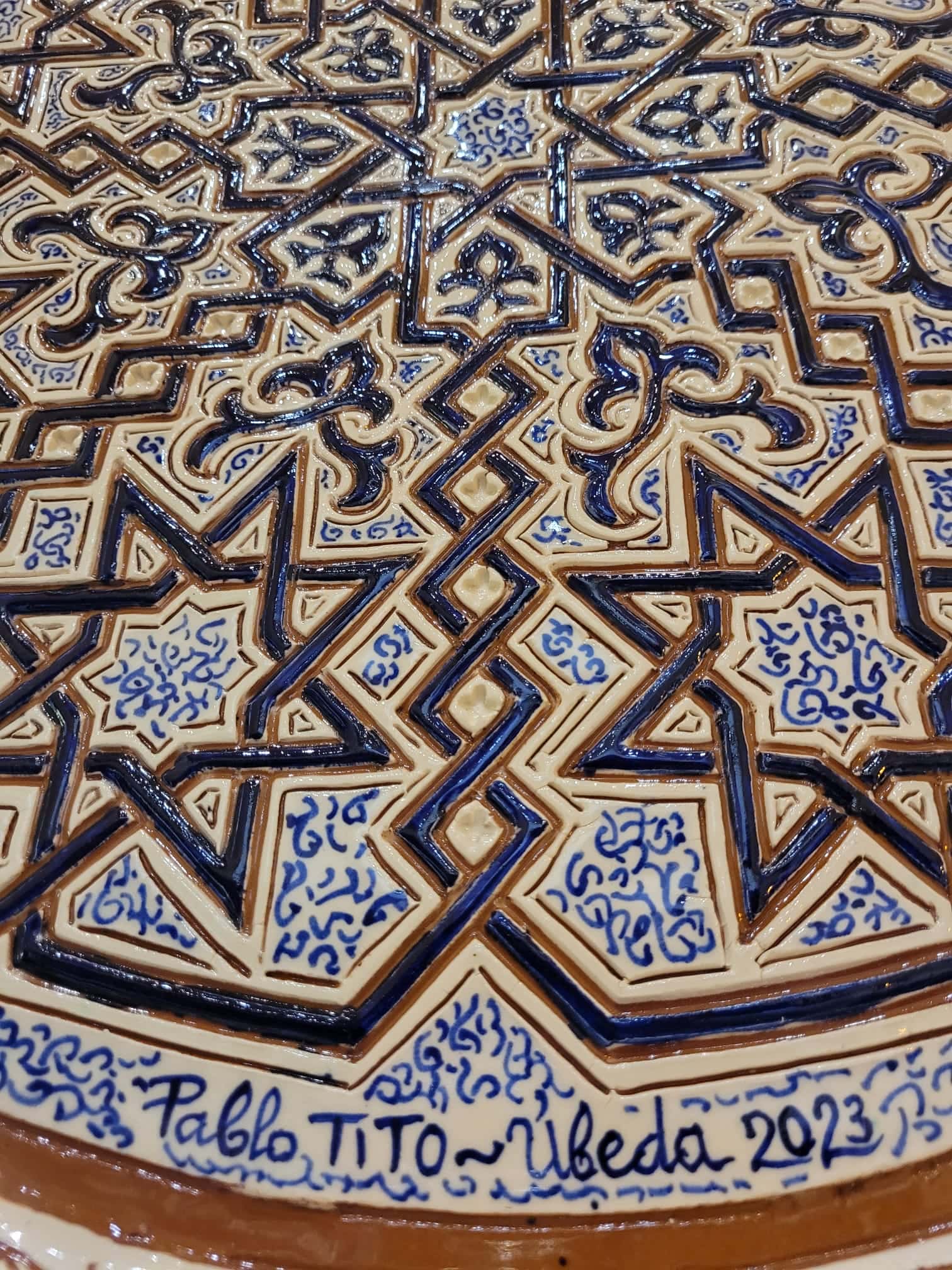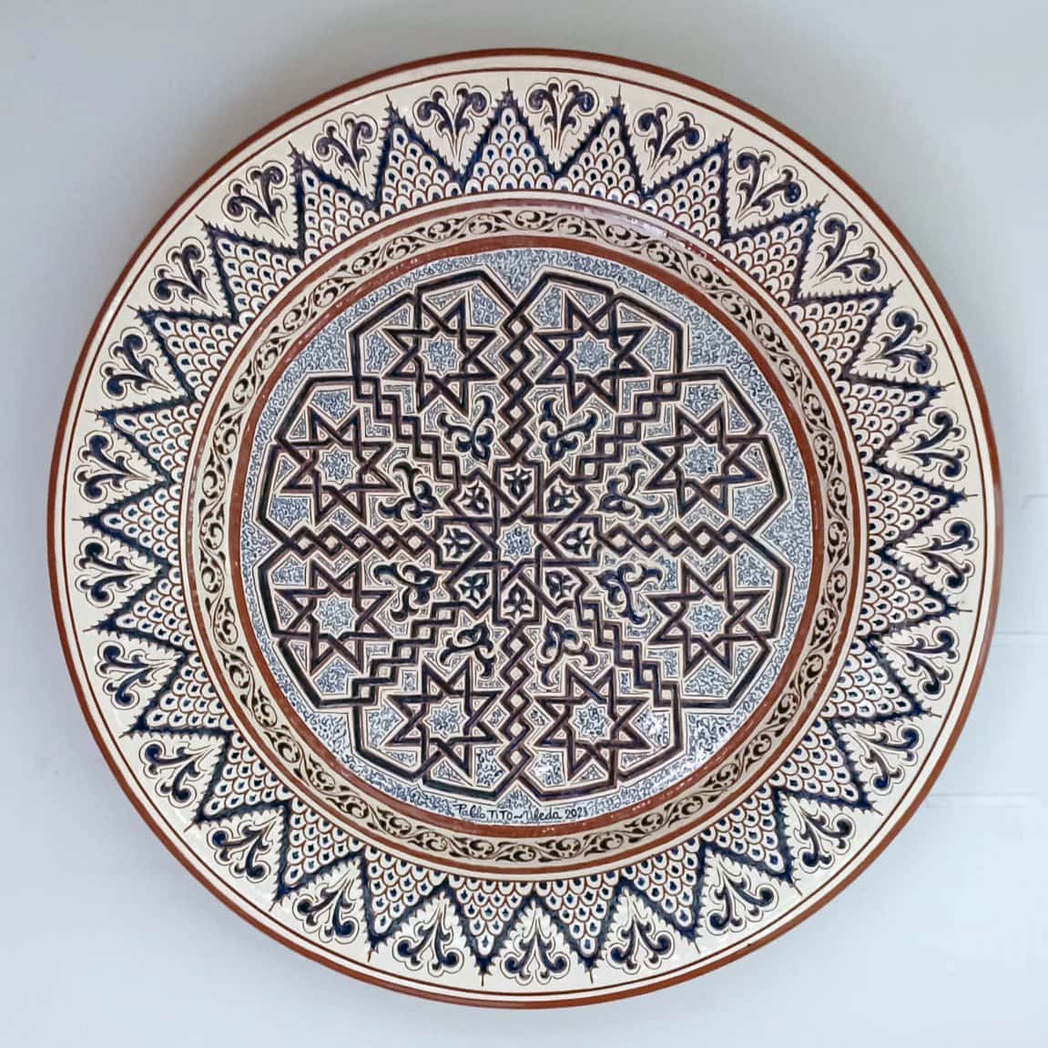 La obra del alfarero ubetense  Pablo TITO  Plato grande lacería mudéjar  es de grandes dimensiones, con motivo decorativo consistente en una serie de líneas entrecruzadas que dan origen a formas estrelladas y poligonales.
